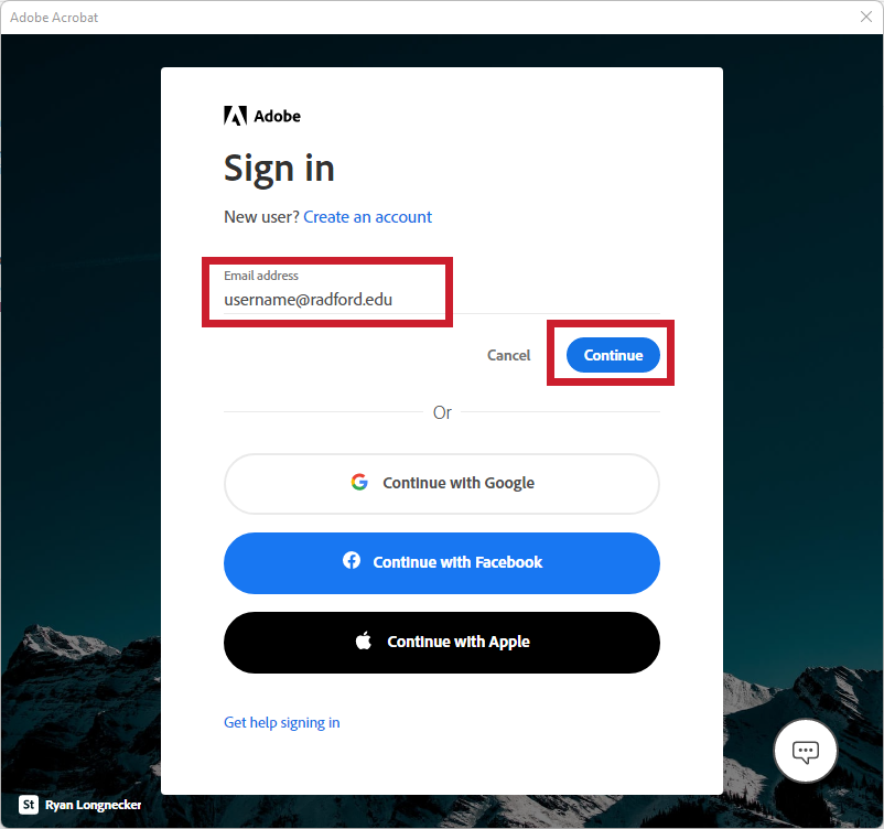 1. Open the Adobe Acrobat program, enter your Radford University email address and click Continue.
