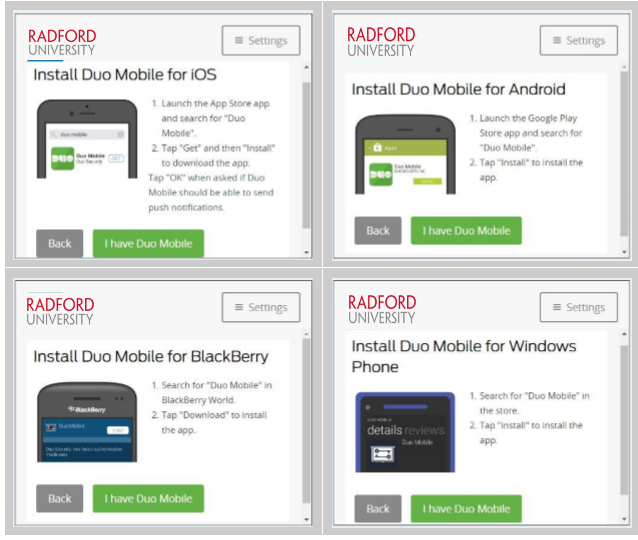 11. Follow the phone-specific instructions on the screen to install Duo Mobile. After installing the app on your device, return to the enrollment window and click I HAVE DUO MOBILE.