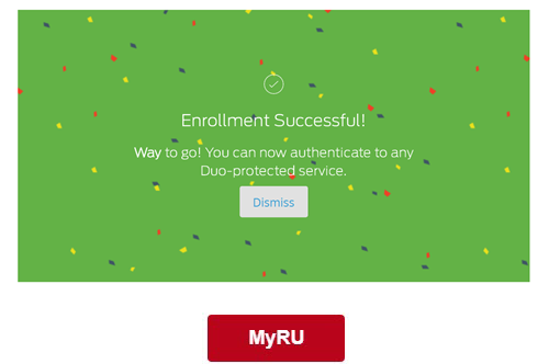 13. After you have activated with the barcode or the link in the email, click Continue to finish enrollment. Once you receive the "Enrollment Successful" message, you can click on "Dismiss" to further customize your device setup or add another device as your backup method. Click on MyRU to exit the Duo Device Management Portal and return to the MyRU Portal.